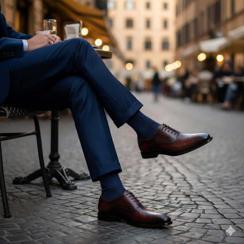 - The Sock Rule: Black shoes require black/charcoal socks. Brown/burgundy shoes invite personality: match the trouser color or choose a sock with a subtle burgundy pattern.